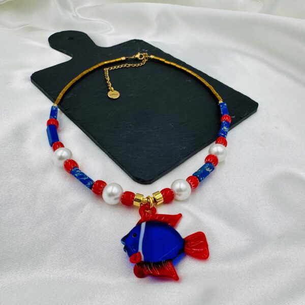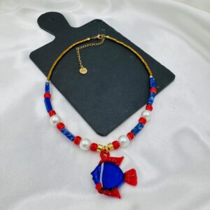Υλικό: Ημιπολύτιμες χάντρες, χάντρες αιματίτη και στοιχεία από επιχρυσωμένο (24Κ) ορείχαλκο και murano